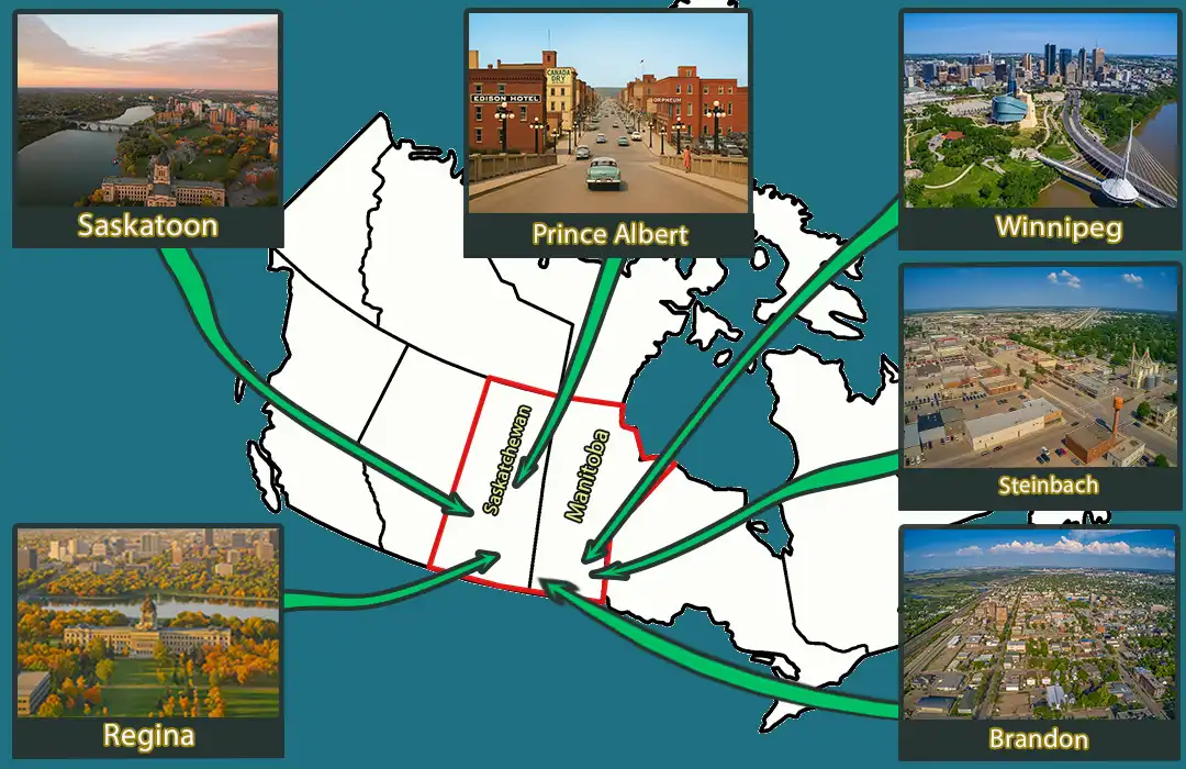 Winnipeg, Regina, Saskatoon, Brandon, Lethbridge.