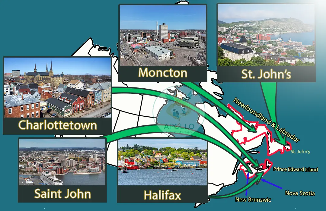 🏙️ Thành phố tiêu biểu:: Halifax, St. John’s, Moncton, Saint John, Charlottetown..