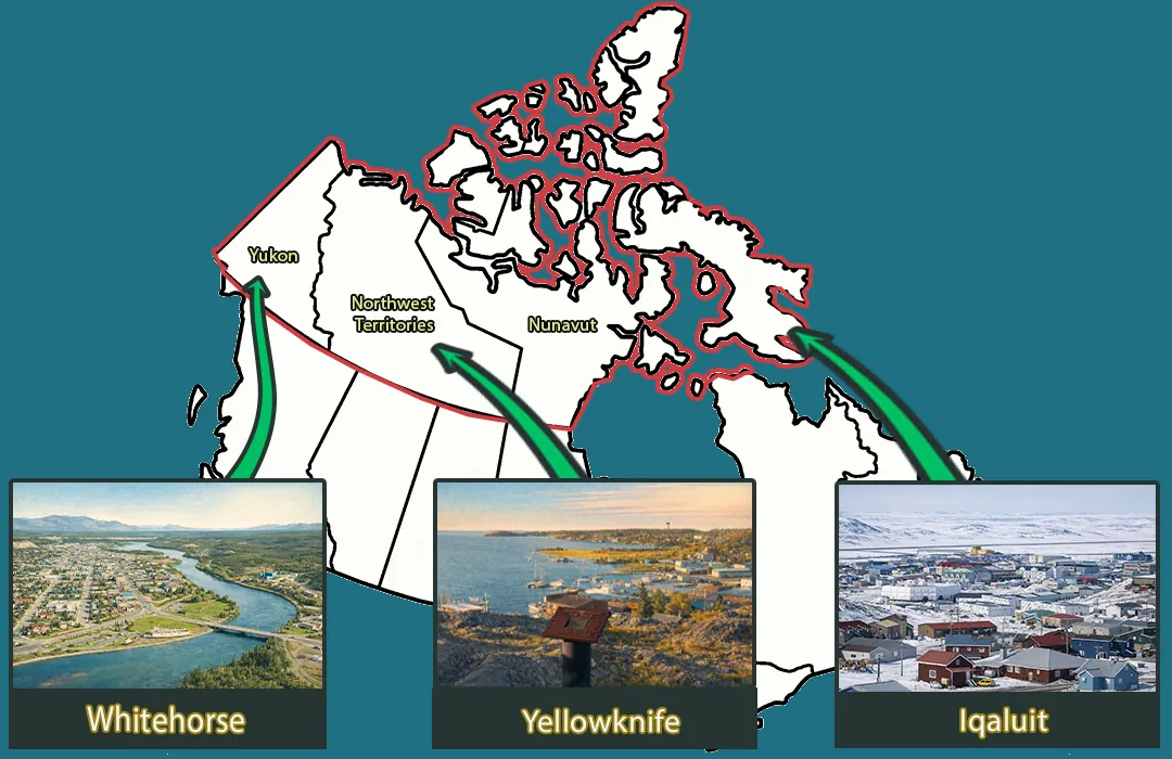 Whitehorse, Yellowknife, Iqaluit, Inuvik, Rankin Inlet.