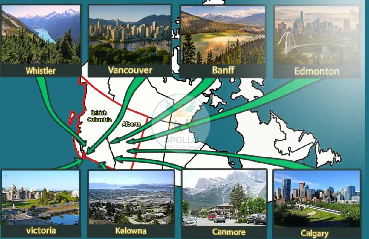– Là quốc gia liên bang gồm 10 tỉnh bang và 3 vùng lãnh thổ, Canada có thủ đô Ottawa và các thành phố lớn như Toronto, Vancouver, Montreal. Quốc gia này tiếp giáp Hoa Kỳ, có ba đại dương bao quanh và nổi tiếng với môi trường sống trong lành, an toàn và đa văn hóa.