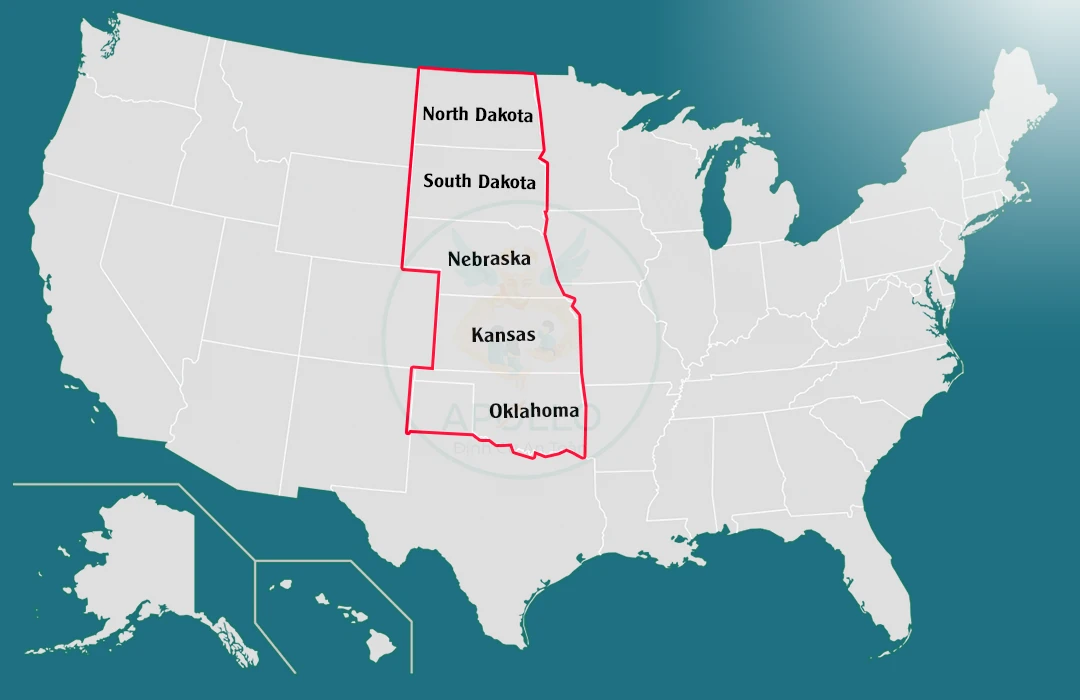 Texas (miền Panhandle & bắc), Oklahoma, Kansas, Nebraska, South Dakota, North Dakota.