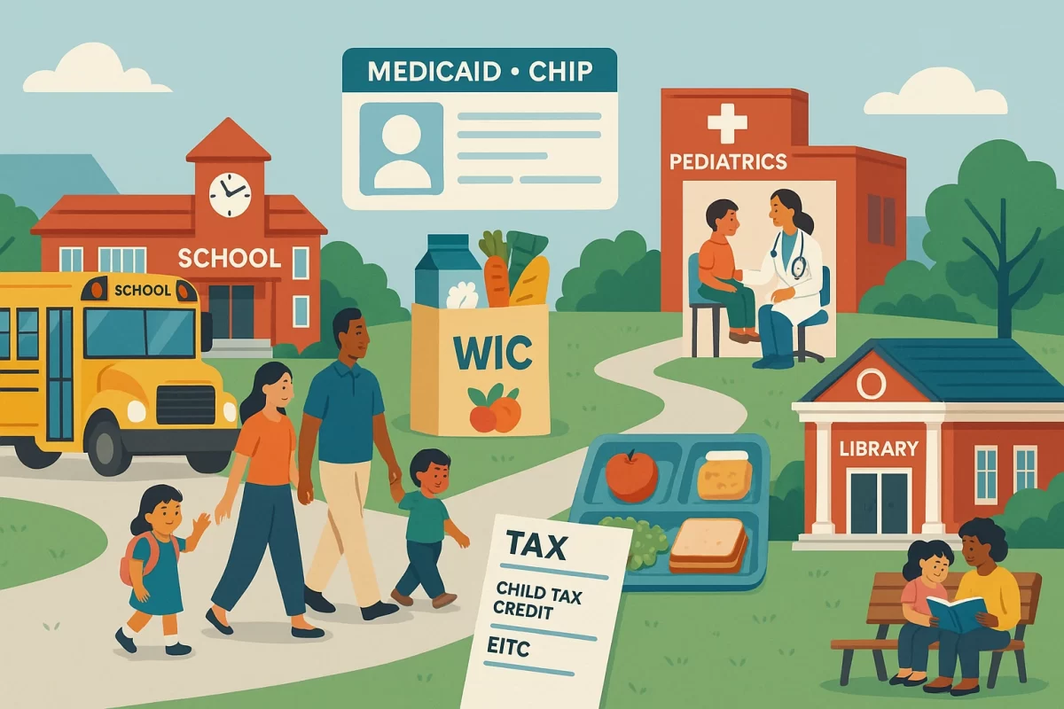 • Chương trình Head Start (mẫu giáo cho trẻ thu nhập thấp), xe bus trường học, sân chơi, thư viện.