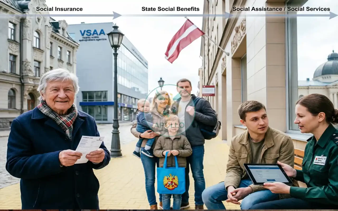 • Đời sống an sinh xã hội Latvia được xây dựng trên sự kết hợp giữa bảo hiểm xã hội bắt buộc, trợ cấp nhà nước, dịch vụ công và hỗ trợ từ chính quyền địa phương; cơ quan trung tâm là Ministry of Welfare / Labklājības ministrija và việc chi trả do State Social Insurance Agency – VSAA thực hiện.